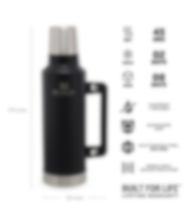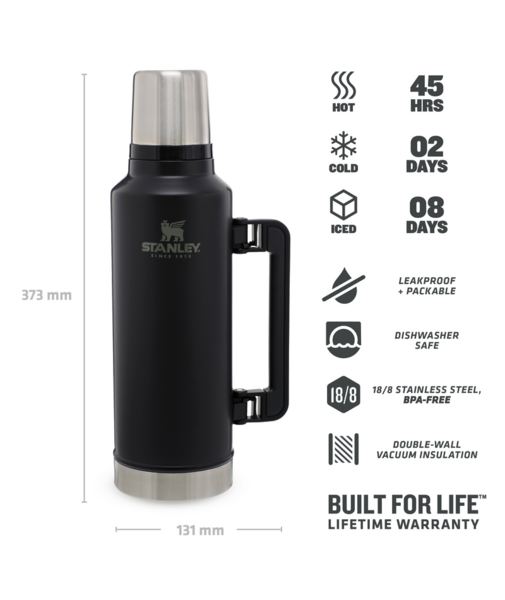 Termosen er laget i kraftig rustfritt stål, og er naturlig BPA- fri. Volum: 1,9 liter. Termosen kommer i klassisk Stanley - matt sort (matt black).
